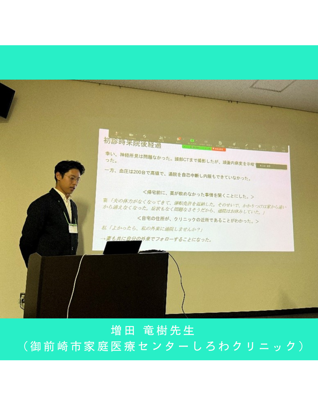 後半の事例検討では3例の症例が提示され、そのうちの1例を、浜松医科大学卒業生で当プログラム所属の増田竜樹先生が発表しました。若手医師による実践的な症例提示に対し、参加者やシンポジストの先生方から多くの助言が寄せられ、プライマリ・ケアに関心をもつ学生や若手医師にとって、臨床・教育・地域医療を横断的に学ぶことのできる貴重な場となりました。