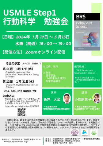昨年より引き続き、浜松医科大学国際化推進センターおよび東京女子医科大学の小笠原知子先生の御助力を得て、USMLE Step1 行動科学の勉強会をオンラインで継続しております。