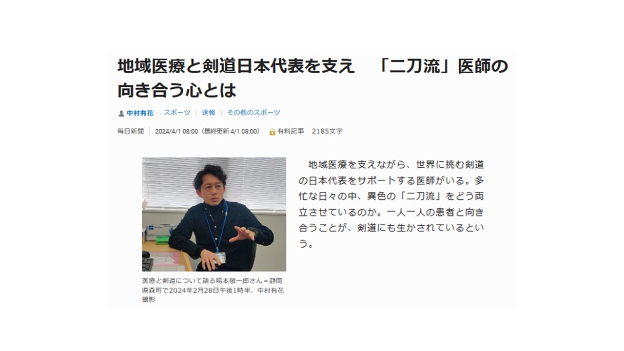 毎日新聞(4月1日)に、鳴本准教授の紹介記事『地域医療と剣道日本代表を支え「二刀流」医師の向き合う心とは』が掲載されました。