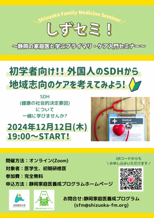 静岡家庭医養成プログラム主催の《しずセミ!〜静岡の家庭医と学ぶプライマリ・ケア入門セミナー》のご案内です。