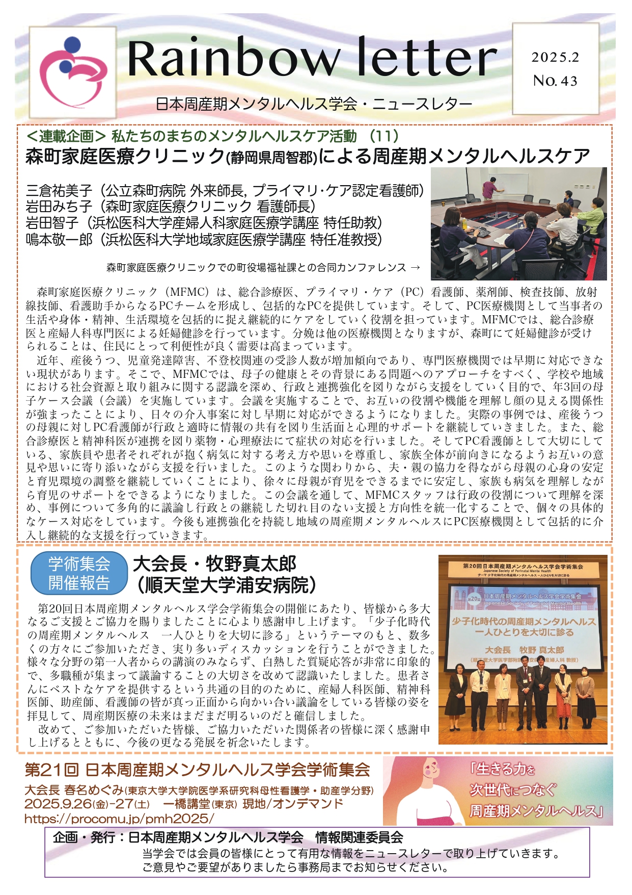 森町家庭医療クリニックでのプライマリ・ケアチームによる周産期メンタルヘルスケアの取り組みが、日本周産期メンタルヘルス学会ニュースレターに掲載されました。