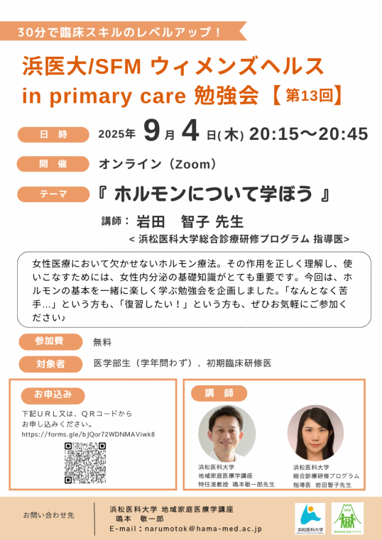 浜医大/SFM ウィメンズヘルス in primary care 勉強会の開催のご案内です。【日 時】2025年9月4日(木) 20:15-20:45