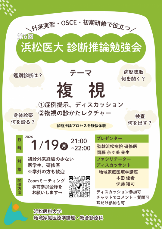 本学の家庭医療のポリクリでは初診外来の実習を行っていますが、学生時代に診断推論について学べる機会は多くありません。