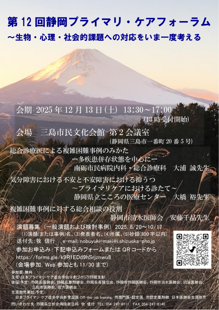 2025年12月13日(土)、三島市民文化会館にて『第12回 静岡プライマリ・ケアフォーラム』がハイブリッド形式で開催され、現地参加34名、Web参加51名の計85名が参加しました。